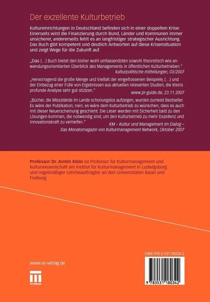 "Man kann Prof. Armin Klein eines nicht nachsagen: dass er kein Gespür für die richtigen Themen hat. Seine Bücher kamen stets zum richtigen Zeitpunkt, um den Kulturbetrieb auf wichtige Entwicklungen vorzubereiten. Diesmal scheint es so, als wolle er zur richtigen Zeit wachrütteln. [...] Bücher, die Missstände im Lande schonungslos aufzeigen, wurden zumeist Bestseller. Es wäre der Publikation, neun, es wäre dem Kulturbetrieb zu wünschen, dass es auch mit dieser Neuerscheinung geschieht. Die Leser werden mit Sicherheit bald zu den Lösungen kommen, die notwendig sind, um den Kulturbetrieb zu mehr Exzellenz und Innovationskraft zu verhelfen." KM - Kultur und Management im Dialog - DasMonatsmagazin von Kulturmanagement Network, Oktober 2007