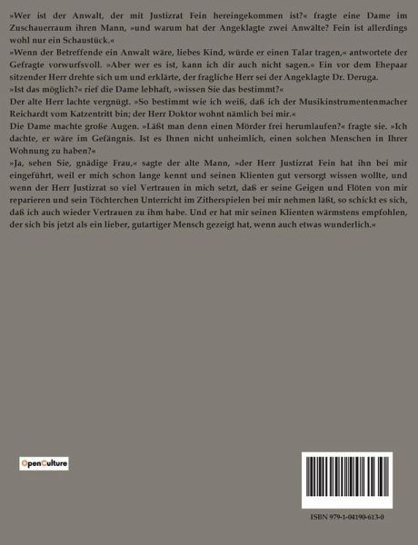 »Wer ist der Anwalt, der mit Justizrat Fein hereingekommen ist?« fragte eine Dame im Zuschauerraum ihren Mann, »und warum hat der Angeklagte zwei Anwälte? Fein ist allerdings wohl nur ein Schaustück.« »Wenn der Betreffende ein Anwalt wäre, liebes Kind, würde er einen Talar tragen,« antwortete der Gefragte vorwurfsvoll. »Aber wer es ist, kann ich dir auch nicht sagen.« Ein vor dem Ehepaar sitzender Herr drehte sich um und erklärte, der fragliche Herr sei der Angeklagte Dr. Deruga. »Ist das möglich?« rief die Dame lebhaft, »wissen Sie das bestimmt?« Der alte Herr lachte vergnügt. »So bestimmt wie ich weiß, daß ich der Musikinstrumentenmacher Reichardt vom Katzentritt bin; der Herr Doktor wohnt nämlich bei mir.« Die Dame machte große Augen. »Läßt man denn einen Mörder frei herumlaufen?« fragte sie. »Ich dachte, er wäre im Gefängnis. Ist es Ihnen nicht unheimlich, einen solchen Menschen in Ihrer Wohnung zu haben?« »Ja, sehen Sie, gnädige Frau,« sagte der alte Mann, »der Herr Justizrat Fein hat ihn bei mir eingeführt, weil er mich schon lange kennt und seinen Klienten gut versorgt wissen wollte, und wenn der Herr Justizrat so viel Vertrauen in mich setzt, daß er seine Geigen und Flöten von mir reparieren und sein Töchterchen Unterricht im Zitherspielen bei mir nehmen läßt, so schickt es sich, daß ich auch wieder Vertrauen zu ihm habe. Und er hat mir seinen Klienten wärmstens empfohlen, der sich bis jetzt als ein lieber, gutartiger Mensch gezeigt hat, wenn auch etwas wunderlich.«