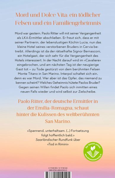 Mord war gestern. Paolo Ritter will mit seiner Vergangenheit als LKA-Ermittler abschließen. Er freut sich, dass er mit seiner Partnerin, der lebenslustigen Köchin Lucia, nun das kleine Hotel seines verstorbenen Bruders in Cervia betreibt. Allerdings ist da der rätselhafte Signor Bernasconi, ein Hotelgast, der sich sehr für die Vergangenheit des Hotels interessiert. In der Nacht darauf wird im «Cavaliere» eingebrochen und am nächsten Tag ist der neugierige Gast tot - zu Tode gestürzt von dem berühmten Felsen Monte Titano in San Marino. Interpol schaltet sich ein, denn es war Mord. Wer aber ist das Opfer, das niemand zu kennen scheint? Welches Geheimnis hütete Paolos Bruder? Gegen seinen Willen findet Paolo sich inmitten eines neuen Falls wieder und wird selbst zur Zielscheibe. Denn ob in der spektakulären Seilbahn von San Marino oder im Treiben des berühmten Mittelalter-Festivals - die Urlaubsidylle der Serenissima birgt dunkle Überraschungen.