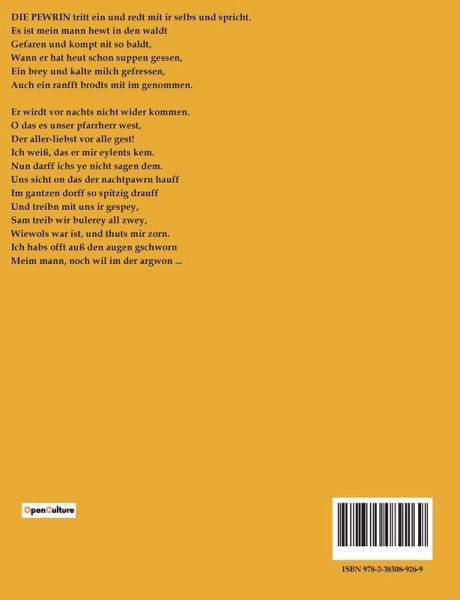 DIE PEWRIN tritt ein und redt mit ir selbs und spricht. Es ist mein mann hewt in den waldt Gefaren und kompt nit so baldt, Wann er hat heut schon suppen gessen, Ein brey und kalte milch gefressen, Auch ein ranfft brodts mit im genommen. Er wirdt vor nachts nicht wider kommen. O das es unser pfarrherr west, Der aller-liebst vor alle gest! Ich weiß, das er mir eylents kem. Nun darff ichs ye nicht sagen dem. Uns sicht on das der nachtpawrn hauff Im gantzen dorff so spitzig drauff Und treibn mit uns ir gespey, Sam treib wir bulerey all zwey, Wiewols war ist, und thuts mir zorn. Ich habs offt auß den augen gschworn Meim mann, noch wil im der argwon ...
