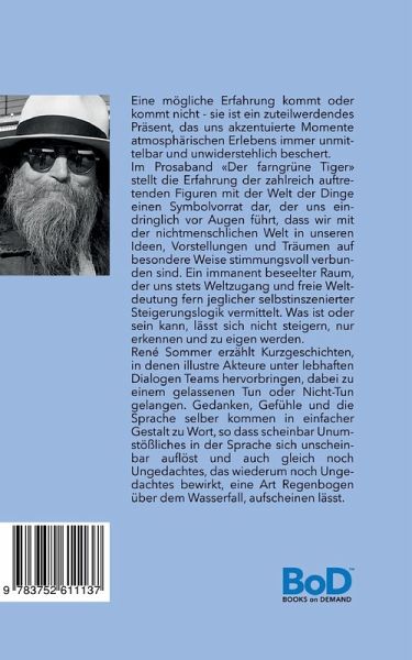 Eine mögliche Erfahrung kommt oder kommt nicht - sie ist ein zuteilwerdendes Präsent, das uns akzentuierte Momente atmosphärischen Erlebens immer unmittelbar und unwiderstehlich beschert. Im Prosaband «Der farngrüne Tiger» stellt die Erfahrung der zahlreich auftretenden Figuren mit der Welt der Dinge einen Symbolvorrat dar, der uns eindringlich vor Augen führt, dass wir mit der nichtmenschlichen Welt in unseren Ideen, Vorstellungen und Träumen auf besondere Weise stimmungsvoll verbunden sind. Ein immanent beseelter Raum, der uns stets Weltzugang und freie Weltdeutung fern jeglicher selbstinszenierter Steigerungslogik vermittelt. Was ist oder sein kann, lässt sich nicht steigern, nur erkennen und zu eigen werden.René Sommer erzählt Kurzgeschichten, in denen illustre Akteure unter lebhaften Dialogen Teams hervorbringen, dabei zu einem gelassenen Tun oder Nicht-Tun gelangen. Gedanken, Gefühle und die Sprache selber kommen in einfacher Gestalt zu Wort, so dass scheinbar Unumstössliches in der Sprache sich unscheinbar auflöst und auch gleich noch Ungedachtes, das wiederum noch Ungedachtes bewirkt, eine Art Regenbogen über dem Wasserfall, aufscheinen lässt.