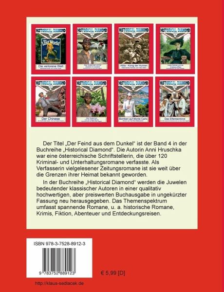 Der Titel 'Der Feind aus dem Dunkel' ist der Band 4 in der Buchreihe 'Historical Diamond'. Die Autorin Anni Hruschka war eine österreichische Schriftstellerin, die über 120 Kriminal- und Unterhaltungsromane verfasste. Als Verfasserin vielgelesener Zeitungsromane ist sie weit über die Grenzen ihrer Heimat bekannt geworden. In der Buchreihe 'Historical Diamond' werden die Juwelen bedeutender klassischer Autoren in einer qualitativ hochwertigen, aber preiswerten Buchausgabe in ungekürzter Fassung neu herausgegeben. Das Themenspektrum umfasst spannende Romane, u. a. historische Romane, Krimis, Fiktion, Abenteuer und Entdeckungsreisen.