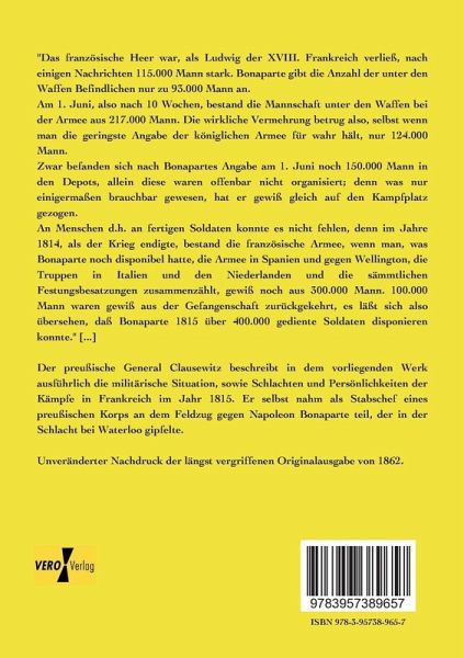 Der preußische General Clausewitz beschreibt in dem vorliegenden Werk ausführlich die militärische Situation, sowie Schlachten und Persönlichkeiten der Kämpfe in Frankreich im Jahr 1815. Er selbst nahm als Stabschef eines preußischen Korps an dem Feldzug gegen Napoleon Bonaparte teil, der in der Schlacht bei Waterloo gipfelte.