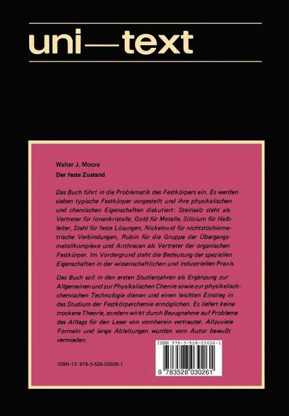 1. Steinsalz.- 1.1. Kristallsymmetrie.- 1.2. Punktgruppen.- 1.3. Gesetz der rationalen Indices und Kristallsysteme.- 1.4. Millersche Indices.- 1.5. Einschränkungen in der Kristallsymmetrie.- 1.6. Kristallgitter und Elementarzelle.- 1.7. Röntgenstrahlen und Kristallstruktur.- 1.8. Braggsche Reflexion.- 1.9. Die NaC1-Kristallstruktur.- 1.10. Die Bindung im NaCl-Kristall.- 1.11. Gitterenergie.- 1.12. Schwingungsenergie und Infrarot-Spektrum.- 1.13. Schwingungen in einem einatomigen Festkörper.- 1.14. Modell für die Schwingung in einem Ionenkristall.- 1.15. Punktfehler in Alkalihalogeniden.- 1.16. Fehlordnungsgrad.- 1.17. Diffusion und Ionenbeweglichkeit.- 1.18. Fremdfehlordnung.- 1.19. Farbzentren.- 1.20. V-Zentren.- 2. Gold.- 2.1. Kristallstruktur.- 2.2. Das Elektronengas.- 2.3. Das Paradoxon der spezifischen Wärme.- 2.4. Elektronen als Fermionen.- 2.5. Zustandsdichte.- 2.6. Die Bindung im Metall.- 2.7. Das Kronig-Penney-Modell.- 2.8. Brillouinzonen.- 2.9. Die Oberfläche des "Fermisees".- 2.10. Experimentelle Bestimmung von Brillouinzonen.- 2.11. Legierungen.- 2.12. Katalyse.- 2.13. Ordnungs-Unordnungs-Phänomene.- 2.14. Punktfehler in Metallen.- 3. Silicium.- 3.1. Struktur des Siliciums.- 3.2. Bandschema.- 3.3. Der Hall-Effekt.- 3.4. Elektronen und positive Löcher.- 3.5. Dotiertes Silicium.- 3.6. Die Fermienergie von Halbleitern.- 3.7. Der p-n-Kontakt.- 3.8. Der Transistor.- 3.9. Herstellung von Halbleitereinkristallen.- 3.10. Zonenschmelzverfahren.- 4. Stahl.- 4.1. Kristallstruktur des Eisens.- 4.2. Elektronenkonfiguration des Eisens.- 4.3. Die Löslichkeit von Kohlenstoff im Eisen.- 4.4. Martensit.- 4.5. Perlit.- 4.6. Die mechanischen Eigenschaften des Stahls.- 4.7. Die Festigkeit von Einkristallen.- 4.8. Versetzungen.- 4.9. Versetzungen und Verformung.-4.10. Versetzungsquellen.- 4.11. Versetzungen und Kristallwachstum.- 4.12. Chemische Effekte der Versetzungen.- 4.13. Ferromagnetismus.- 5. Nickeloxid.- 5.1. Kristallstruktur.- 5.2. Magnetische Struktur des Nickeloxids.- 5.3. Elektronenkonfiguration des Nickeloxids.- 5.4. Die Mottsche Theorie.- 5.5. Nichtstöchiometrie.- 5.6. Der thermoelektrische Effekt.- 5.7. Li-dotiertes NiO.- 5.8. Die Oxidation von Nickel.- 5.9. Die Wagnersche Zunder-Theorie.- 6. Rubin.- 6.1. Kristallstruktur.- 6.2. Rubinherstellung.- 6.3. Kristallfeldtheorie.- 6.4. Laser.- 6.5. Rubinlaser.- 6.6. Paramagnetische Ionen im Magnetfeld.- 6.7. Kristallfeld und Magnetfeld.- 6.8. Maser.- 6.9. ESR.- 7. Anthracen.- 7.1. Struktur des Anthracens.- 7.2. Die Bindung im Anthracenkristall.- 7.3. Optische Absorptionsspektren.- 7.4. Excitonen.- 7.5. Luminiszenz.- 7.6. Energietransfer.- 7.7. Photoleitfähigkeit.- Tabellenanhang.- Sachwortregister.