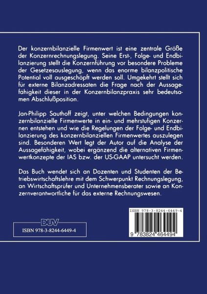 Der konzernbilanzielle Firmenwert ist eine zentrale Größe der Konzernrechnungslegung. Seine Erst-, Folge- und Endbilanzierung stellt die Konzernführung vor besondere Probleme der Gesetzesauslegung, wenn das enorme bilanzpolitische Potential voll ausgeschöpft werden soll. Umgekehrt stellt sich für externe Bilanzadressaten die Frage nach der Aussagefähigkeit dieser in der Konzernbilanzpraxis sehr bedeutsamen Abschlußposition. Jan-Philipp Sauthoff zeigt, unter welchen Bedingungen konzernbilanzielle Firmenwerte in ein- und mehrstufigen Konzernen entstehen und wie die Regelungen der Folge- und Endbilanzierung des konzernbilanziellen Firmenwertes auszulegen sind. Besonderen Wert legt der Autor auf die Analyse der Aussagefähigkeit, wobei ergänzend die alternativen Firmenwertkonzepte der IAS bzw. der US-GAAP untersucht werden.