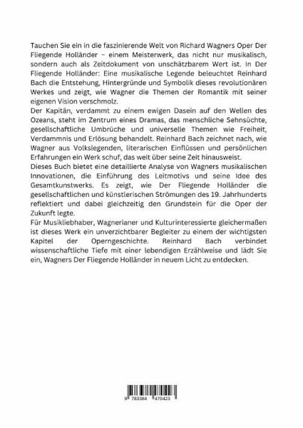Tauchen Sie ein in die faszinierende Welt von Richard Wagners Oper Der Fliegende Holländer - einem Meisterwerk, das nicht nur musikalisch, sondern auch als Zeitdokument von unschätzbarem Wert ist. In Der Fliegende Holländer: Eine musikalische Legende beleuchtet Reinhard Bach die Entstehung, Hintergründe und Symbolik dieses revolutionären Werkes und zeigt, wie Wagner die Themen der Romantik mit seiner eigenen Vision verschmolz.Der Kapitän, verdammt zu einem ewigen Dasein auf den Wellen des Ozeans, steht im Zentrum eines Dramas, das menschliche Sehnsüchte, gesellschaftliche Umbrüche und universelle Themen wie Freiheit, Verdammnis und Erlösung behandelt. Reinhard Bach zeichnet nach, wie Wagner aus Volkslegenden, literarischen Einflüssen und persönlichen Erfahrungen ein Werk schuf, das weit über seine Zeit hinausweist.Dieses Buch bietet eine detaillierte Analyse von Wagners musikalischen Innovationen, die Einführung des Leitmotivs und seine Idee des Gesamtkunstwerks. Es zeigt, wie Der Fliegende Holländer die gesellschaftlichen und künstlerischen Strömungen des 19. Jahrhunderts reflektiert und dabei gleichzeitig den Grundstein für die Oper der Zukunft legte.Für Musikliebhaber, Wagnerianer und Kulturinteressierte gleichermaßen ist dieses Werk ein unverzichtbarer Begleiter zu einem der wichtigsten Kapitel der Operngeschichte. Reinhard Bach verbindet wissenschaftliche Tiefe mit einer lebendigen Erzählweise und lädt Sie ein, Wagners Der Fliegende Holländer in neuem Licht zu entdecken.
