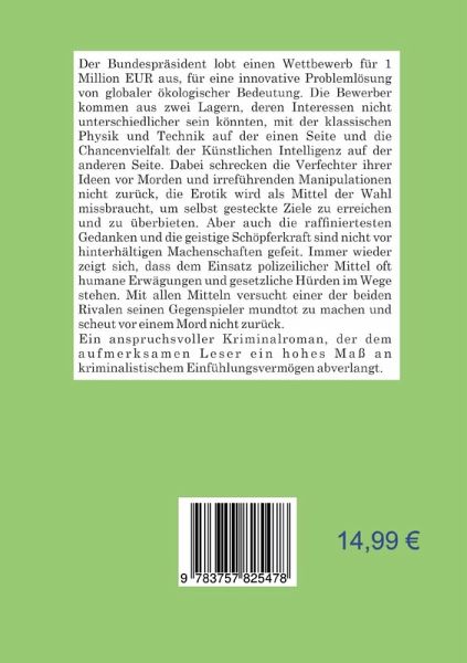 Der Bundespräsident lobt einen Wettbewerb für 1 Million EUR aus, für eine innovative Problemlösung von globaler ökologischer Bedeutung. Die Bewerber kommen aus zwei Lagern, deren Interessen nicht unterschiedlicher sein könnten, mit der klassischen Physik und Technik auf der einen Seite und die Chancenvielfalt der Künstlichen Intelligenz auf der anderen Seite. Dabei schrecken die Verfechter ihrer Ideen vor Morden und irreführenden Manipulationen nicht zurück, die Erotik wird als Mittel der Wahl missbraucht, um selbst gesteckte Ziele zu erreichen und zu überbieten. Aber auch die raffiniertesten Gedanken und die geistige Schöpferkraft sind nicht vor hinterhältigen Machenschaften gefeit. Immer wieder zeigt sich, dass dem Einsatz polizeilicher Mittel oft humane Erwägungen und gesetzliche Hürden im Wege stehen. Mit allen Mitteln versucht einer der beiden Rivalen seinen Gegenspieler mundtot zu machen und scheut vor einem Mord nicht zurück. Ein anspruchsvoller Kriminalroman, der dem aufmerksamen Leser ein hohes Maß an kriminalistischem Einfühlungsvermögen abverlangt.