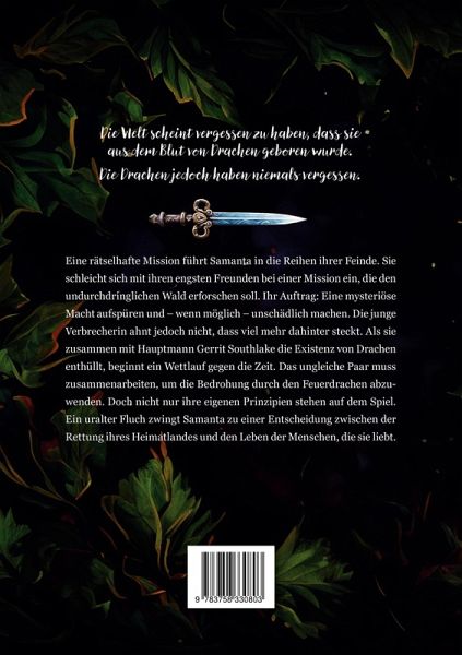 Die Welt scheint vergessen zu haben, dass sie aus dem Blut von Drachen geboren wurde.Die Drachen jedoch haben niemals vergessen.Eine rätselhafte Mission führt Samanta in die Reihen ihrer Feinde. Sie schleicht sich mit ihren engsten Freunden bei einer Mission ein, die den undurchdringlichen Wald erforschen soll. Ihr Auftrag: Eine mysteriöse Macht aufspüren und unschädlich machen. Die junge Verbrecherin ahnt jedoch nicht, dass viel mehr dahinter steckt. Als sie zusammen mit Hauptmann Gerrit Southlake die Existenz von Drachen enthüllt, beginnt ein Wettlauf gegen die Zeit. Das ungleiche Paar muss zusammenarbeiten, um die Bedrohung durch den Feuerdrachen abzuwenden. Doch nicht nur ihre eigenen Prinzipien stehen auf dem Spiel. Ein uralter Fluch zwingt Samanta zu einer Entscheidung zwischen der Rettung ihres Heimatlandes und den Leben der Menschen, die sie liebt.