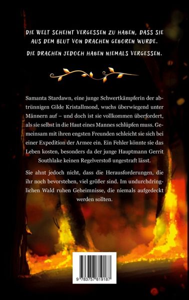 Tauche ein in das epische Abenteuer von Samanta Stardawn und erlebe eine Welt voller Geheimnisse und Intrigen!Die Welt scheint vergessen zu haben, dass sie aus dem Blut von Drachen geboren wurde. Die Drachen jedoch haben niemals vergessen. Samanta Stardawn, eine junge Schwertkämpferin der abtrünnigen Gilde Kristallmond, wuchs unter Männern auf. Doch als sie selbst in die Haut eines Mannes schlüpfen muss, ist sie vollkommen überfordert. Gemeinsam mit ihren engsten Freunden schleicht sie sich bei einer Expedition der Armee ein. Ein Fehler könnte sie das Leben kosten, der Hauptmann Gerrit Southlake lässt keinen Regelverstoß in seiner Truppe ungestraft. Noch ahnt Samanta nicht, dass ihr noch weit größere Herausforderungen bevorstehen. Denn im undurchdringlichen Wald ruhen Geheimnisse, die niemals aufgedeckt werden sollten.