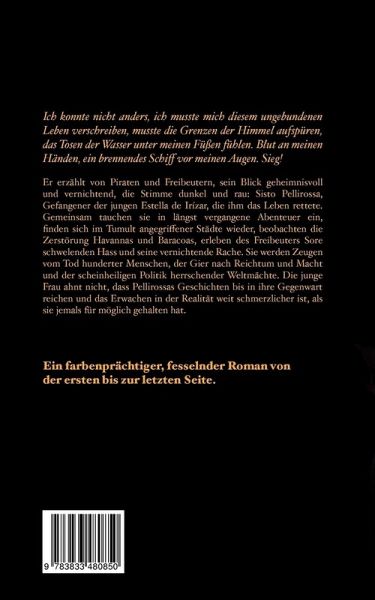Ich konnte nicht anders, ich musste mich diesem ungebundenen Leben verschreiben, musste die Grenzen der Himmel aufspüren, das Tosen der Wasser unter meinen Füßen fühlen. Blut an meinen Händen, ein brennendes Schiff vor meinen Augen. Sieg!Er erzählt von Piraten und Freibeutern, sein Blick geheimnisvoll und vernichtend, die Stimme dunkel und rau: Sisto Pellirossa, Gefangener der jungen Estella de Irízar, die ihm das Leben rettete. Gemeinsam tauchen sie in längst vergangene Abenteuer ein, finden sich im Tumult angegriffener Städte wieder, beobachten die Zerstörung Havannas und Baracoas, erleben des Freibeuters Sore schwelenden Hass und seine vernichtende Rache. Sie werden Zeugen vom Tod hunderter Menschen, der Gier nach Reichtum und Macht und der scheinheiligen Politik herrschender Weltmächte.Die junge Frau ahnt nicht, dass Pellirossas Geschichten bis in ihre Gegenwart reichen und das Erwachen in der Realität weit schmerzlicher ist, als sie jemals für möglich gehalten hat.Ein farbenprächtiger, fesselnder Roman von der ersten bis zur letzten Seite