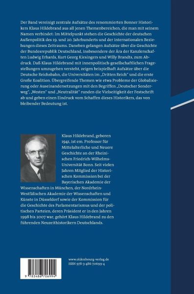 Der Band vereinigt zentrale Aufsätze des renommierten Bonner Historikers Klaus Hildebrand aus all jenen Themenbereichen, die man mit seinem Namen verbindet: Im Mittelpunkt stehen die Geschichte der deutschen Außenpolitik des 19. und 20. Jahrhunderts und der internationalen Beziehungen dieses Zeitraums. Daneben gelangen Aufsätze über die Geschichte der Bundesrepublik Deutschland, insbesondere der Ära der Kanzlerschaften Ludwig Erhards, Kurt Georg Kiesingers und Willy Brandts, zum Abdruck. Daß Klaus Hildebrand mit innenpolitisch-gesellschaftlichen Fragestellungen umzugehen versteht, zeigen beispielhaft Aufsätze über die Deutsche Reichsbahn, die Universitäten im "Dritten Reich" und die erste Große Koalition. Übergreifende Themen wie etwa Probleme der Globalisierung oder Auseinandersetzungen mit den Begriffen "Deutscher Sonderweg", "Westen" und "Neutralität" runden die Vielseitigkeit dieser Festschrift ab und geben einen Eindruck vom Schaffen dieses Historikers, das von bleibender Bedeutung ist.