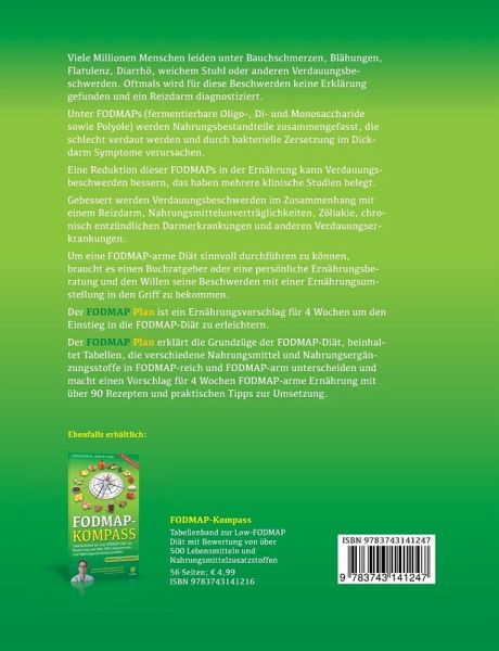 Viele Millionen Menschen leiden unter Bauchschmerzen, Blähungen, Flatulenz, Diarrhö, weichem Stuhl oder anderen Verdauungsbeschwerden. Oftmals wird für diese Beschwerden keine Erklärung gefunden und ein Reizdarm diagnostiziert. Unter FODMAPs (fermentierbare Oligo-, Di- und Monosaccharide sowie Polyole) werden Nahrungsbestandteile zusammengefasst, die schlecht verdaut werden und durch bakterielle Zersetzung im Dickdarm Symptome verursachen Eine Reduktion dieser FODMAPs in der Ernährung kann Verdauungsbeschwerden bessern, das haben mehrere klinische Studien belegt. Gebessert werden Verdauungsbeschwerden im Zusammenhang mit einem Reizdarm, Nahrungsmittelunverträglichkeiten, Zöliakie, chronisch entzündlichen Darmerkrankungen und anderen Verdauungserkrankungen. Um eine FODMAP-arme Diät sinnvoll durchführen zu können, braucht es einen Buchratgeber oder eine persönliche Ernährungsberatung und den Willen seine Beschwerden mit einer Ernährungsumstellung in den Griff zu bekommen. Der FODMAP Plan ist ein Ernährungsvorschlag für 4 Wochen um den Einstieg in die FODMAP-Diät zu erleichtern. Der FODMAP Plan erklärt die Grundzüge der FODMAP-Diät, beinhaltet Tabellen, die verschiedene Nahrungsmittel und Nahrungsergänzungsstoffe in FODMAP-reich und FODMAP-arm unterscheiden und macht einen Vorschlag für 4 Wochen FODMAP-arme Ernährung mit über 90 Rezepten und praktischen Tips zur Umsetzung.2. Auflage