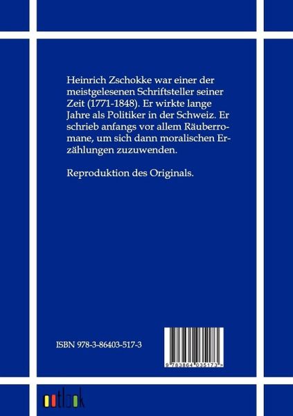 Heinrich Zschokke war einer der meistgelesenen Schriftsteller seiner Zeit (1771-1848). Er wirkte lange Jahre als Politiker in der Schweiz. Er schrieb anfangs vor allem Räuberromane, um sich dann moralischen Erzählungen zuzuwenden. Reproduktion des Originals.