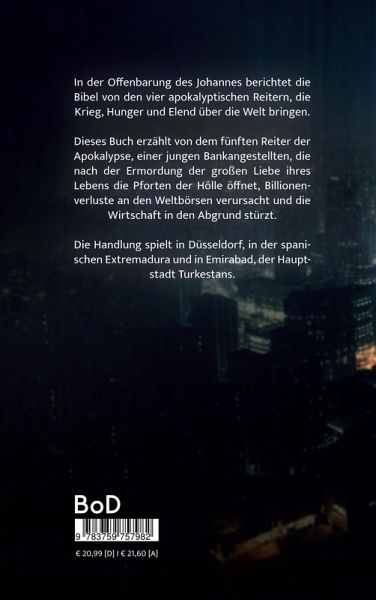 In der Offenbarung des Johannes berichtet die Bibel von den vier apokalyptischen Reitern, die Krieg, Hunger und Elend über die Welt bringen. Dieses Buch erzählt von dem fünften Reiter der Apokalypse, einer jungen Bankangestellten, die nach der Ermordung der großen Liebe ihres Lebens die Pforten der Hölle öffnet, Billionenverluste an den Weltbörsen verursacht und die Wirtschaft in den Abgrund stürzt. Die Handlung spielt in Düsseldorf, in der spanischen Extremadura und in Emirabad, der Hauptstadt Turkestans.