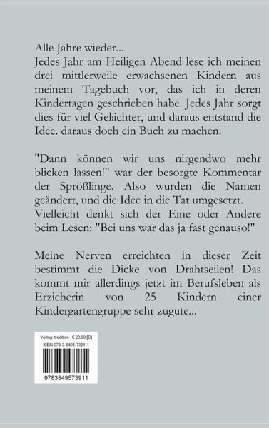 Alle Jahre wieder.Jedes Jahr am Heiligen Abend lese ich meinen drei mittlerweile erwachsenen Kindern aus meinem Tagebuch vor, das ich in deren Kindertagen geschrieben habe. Jedes Jahr sorgt dies für viel Gelächter, und daraus entstand die Idee. daraus doch ein Buch zu machen. "Dann können wir uns nirgendwo mehr blicken lassen!" war der besorgte Kommentar der Sprößlinge. Also wurden die Namen geändert, und die Idee in die Tat umgesetzt. Vielleicht denkt sich der Eine oder Andere beim Lesen: "Bei uns war das ja fast genauso!"Meine Nerven erreichten in dieser Zeit bestimmt die Dicke von Drahtseilen! Das kommt mir allerdings jetzt im Berufsleben als Erzieherin von 25 Kindern einer Kindergartengruppe sehr zugute.