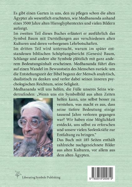 Es gibt einen Garten in uns, den zu pflegen schon die alten Ägypter als wesentlich erachteten, wie Medhananda anhand eines 3500 Jahre alten Hieroglyphentextes und vielen Bildern aufzeigt. Im zweiten Teil dieses Buches erläutert er ausführlich das Symbol Baum mit Darstellungen aus verschiedenen alten Kulturen und deren verborgenen Lehrbotschaften. Im dritten Teil wird untersucht, warum im später entstandenen biblischen Schöpfungsbericht (Genesis) Baum, Schlange und andere alte Symbole plötzlich mit ganz anderem Bedeutungsinhalt erscheinen. Medhananda führt dies auf einen Wandel im Bewusstsein des Menschen zurück: um die Entstehungszeit der Bibel begann der Mensch analytisch, dualistisch zu denken und verlor dabei seinen inneren psychologischen Reichtum, seine Seligkeit. Medhananda will uns helfen, die Fülle unseres Seins wiederzufinden: "Wenn uns ein Symbolbild aus alten Zeiten helfen kann, uns selbst besser zu verstehen, was macht es aus, dass seine tiefere Bedeutung einige tausend Jahre verloren gegangen war? Wir haben eine Möglichkeit entdeckt, uns selbst zu erforschen und unsere vielen Seelenkräfte zur Entfaltung zu bringen." Das Buch enthält zahlreiche nachgezeichnete Bilder aus alten Kulturen, vor allem aus dem alten Ägypten.