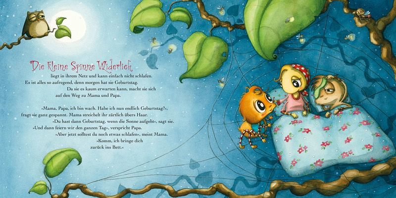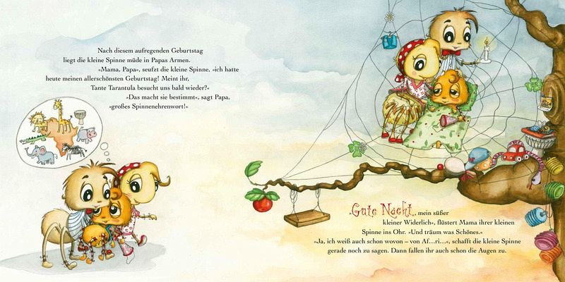 Die kleine Spinne ist ganz aufgeregt, denn sie feiert Geburtstag. Sie hat ihr Netz mit Blümchen geschmückt und alle sind gekommen: Onkel Langbein, Tante Igitte und all ihre Freunde. Sogar Tante Tarantula aus dem fernen Afrika ist angereist. Die Tante erzählt von spannenden Ausflügen, die sie "Safari" nennt, und sorgt für so manche Überraschung auf Klein-Widerlichs Party.