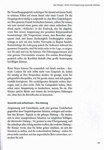 Gedanken lenken die Körpersprache. Nicht äußere Effekte, sondern die innere Haltung begründet einen gelungenen Auftritt im Berufs- und Privatleben. Stefan Spies vermittelt bewährte Schauspieltechniken und zeigt, wie bislang ungenutztes körpersprachliches Potenzial entdeckt und genutzt werden kann. Dabei wird nicht auf äußere Wirkung hin "dressiert", sondern individuell und typgerecht für nonverbale Kommunikation sensibilisiert. Das Buch ermöglicht, Schlüsselsituationen wie Sitzungen, Verhandlungen, Verkaufs- und Vorstellungsgespräche sowie Rede und Präsentation souverän zu meistern, verborgene Hierarchien und Machtkämpfe zu erkennen und gezielt auf nonverbale Signale anderer zu reagieren.
