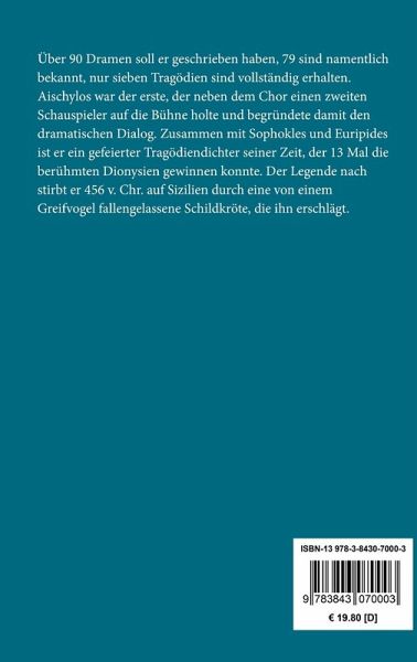 Über 90 Dramen soll er geschrieben haben, 79 sind namentlich bekannt, nur sieben Tragödien sind vollständig erhalten. Aischylos war der erste, der neben demChor einen zweiten Schauspieler auf die Bühne holte und begründete damit den dramatischen Dialog. Zusammen mit Sophokles und Euripides ist er ein gefeierter Tragödiendichter seiner Zeit, der 13 Mal die berühmten Dionysien gewinnen konnte. Der Legende nach stirbt er 456 v. Chr. auf Sizilien durch eine von einem Greifvogel fallengelassene Schildkröte, die ihn erschlägt.