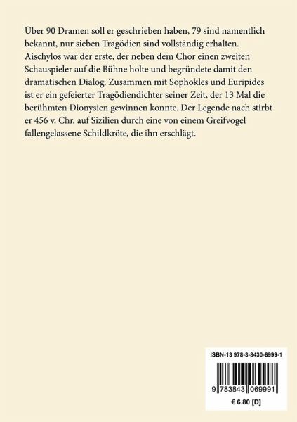 Über 90 Dramen soll er geschrieben haben, 79 sind namentlich bekannt, nur sieben Tragödien sind vollständig erhalten. Aischylos war der erste, der neben demChor einen zweiten Schauspieler auf die Bühne holte und begründete damit den dramatischen Dialog. Zusammen mit Sophokles und Euripides ist er ein gefeierter Tragödiendichter seiner Zeit, der 13 Mal die berühmten Dionysien gewinnen konnte. Der Legende nach stirbt er 456 v. Chr. auf Sizilien durch eine von einem Greifvogel fallengelassene Schildkröte, die ihn erschlägt.