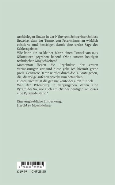 Archäologen finden in der Nähe vom Schweriner Schloss Beweise, dass der Tunnel von Petermännchen wirklich existierte und bestätigen damit eine uralte Sage des Schlossgeistes. Wie kann ein so kleiner Mann einen Tunnel von 8,95 Kilometern gegraben haben? Ohne unsere heutigen technischen Möglichkeiten?Momentan liegen die Ergebnisse der ersten Vermessungen vor und diese gebe ich hiermit gerne preis. Genauere Daten wird es durch die U-Boote geben, die, die vollgelaufenen Strecke nun betauchen. Dieses Buch zeigt die genaue Route des alten Tunnels. War der Petersburg in vergangenen Zeiten eine Pyramide? So, wie auch am Ort des heutigen Schlosses eine Pyramide stand?Eine unglaubliche Entdeckung. Herold zu Moschdehner