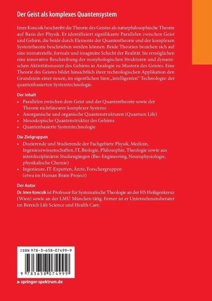 Imre Koncsik beschreibt die Theorie des Geistes als naturphilosophische Theorie auf Basis der Physik. Er identifiziert signifikante Parallelen zwischen Geist und Gehirn, die beide durch Elemente der Quantentheorie und der komplexen Systemtheorie beschrieben werden können. Beide Theorien beziehen sich auf eine immaterielle, formale und imaginäre Schicht der Realität. Sie ermöglichen eine innovative Beschreibung der morphologischen Strukturen und dynamischen Aktivitätsmuster des Gehirns in Analogie zu Mustern des Geistes. Eine Theorie des Geistes bildet hinsichtlich ihrer technologischen Applikation den Grundstein einer neuen, im eigentlichen Sinn intelligenten Technologie: der quantenbasierten Systemtechnologie.