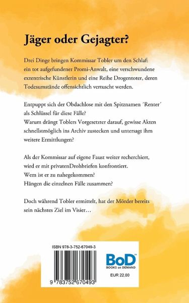 Jäger oder Gejagter?Drei Dinge bringen Kommissar Tobler um den Schlaf: ein tot aufgefundener Promi-Anwalt, eine verschwundene exzentrische Künstlerin und eine Reihe Drogentoter, deren Todesumstände offensichtlich vertuscht werden. Entpuppt sich der Obdachlose mit den Spitznamen ´Renter´ als Schlüssel für diese Fälle?Warum drängt Toblers Vorgesetzter darauf, gewisse Akten schnellstmöglich ins Archiv zu stecken und untersagt ihm weitere Ermittlungen?Als der Kommissar auf eigene Faust weiter recherchiert, wird er mit privaten Drohbriefen konfrontiert.Wem ist er zu nahegekommen? Hängen die einzelnen Fälle zusammen?Doch während Tobler ermittelt, hat der Mörder bereits sein nächstes Ziel im Visier...