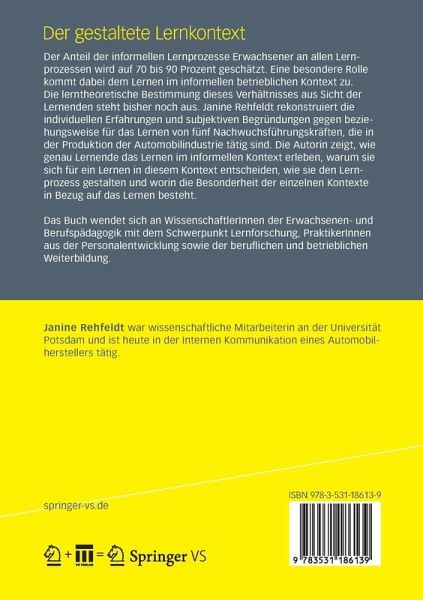 Der Anteil der informellen Lernprozesse Erwachsener an allen Lernprozessen wird auf 70 bis 90 Prozent geschätzt. Eine besondere Rolle kommt dabei dem Lernen im informellen betrieblichen Kontext zu. Die lerntheoretische Bestimmung dieses Verhältnisses aus Sicht der Lernenden steht bisher noch aus. Janine Rehfeldt rekonstruiert die individuellen Erfahrungen und subjektiven Begründungen gegen beziehungsweise für das Lernen, insbesondere die Art des Lernens von fünf Nachwuchsführungskräften, die in der Produktion der Automobilindustrie tätig sind. Die Autorin zeigt, wie genau Lernende das Lernen im informellen Kontext erleben, warum sie sich für ein Lernen in diesem Kontext entscheiden, wie sie den Lernprozess gestalten und worin die Besonderheit der einzelnen Kontexte in Bezug auf das Lernen besteht.