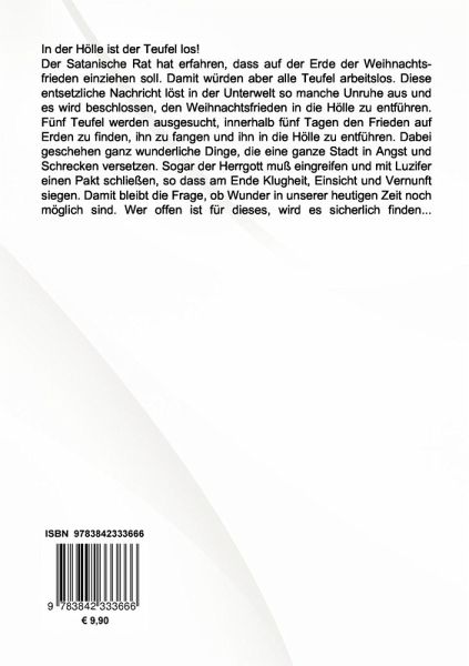 In der Hölle ist der Teufel los!Der Satanische Rat hat erfahren, dass auf der Erde der Weihnachtsfrieden einziehen soll. Damit würden aber alle Teufel arbeitslos. Diese entsetzliche Nachricht löst in der Unterwelt so manche Unruhe aus und es wird beschlossen, den Weihnachtsfrieden in die Hölle zu entführen. Fünf Teufel werden ausgesucht innerhalb fünf Tagen den Frieden auf Erden zu finden, ihn zu fangen und ihn in die Hölle zu entführen. Dabei geschehen ganz wunderliche Dinge, die eine ganze Stadt in Angst und Schrecken versetzen. Sogar der Herrgott muß eingreifen und mit Luzifer einen Pakt schließen, so dass am Ende Klugheit, Einsicht und Vernunft siegen. Damit bleibt die Frage, ob Wunder in unserer heutigen Zeit noch möglich sind. Wer offen ist für dieses, wird es sicherlich finden...