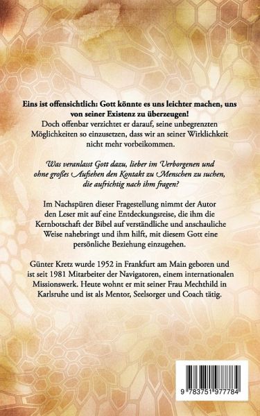 Die Schlussfolgerung, dass Gott nicht existiert, weil wir ihn nicht sehen, ist ein Trugschluss. Wenn wir genauer in und auf diese Welt schauen, können wir Spuren entdecken, die nicht nur auf ihn hinweisen, sondern die uns sogar einladen, mit IHM in Kontakt zu kommen. Mit diesem Buch lockt der Autor den Leser auf eine Entdeckungsreise, die ihm die Kernbotschaft der Bibel auf eine verständliche und anschauliche Weise nahe bringt und dabei eine Tür öffnet, mit diesem verborgenen Gott eine lebendige, persönliche Beziehung einzugehen.