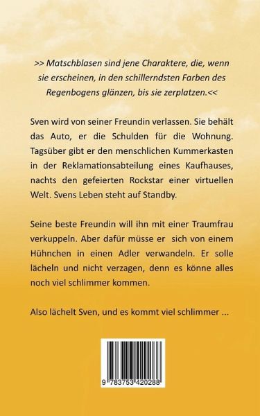 "Matschblasen sind jene Charaktere, die, wenn sie erscheinen, in den schillerndsten Farben des Regenbogens glänzen, bis sie zerplatzen." Sven wird von seiner Freundin verlassen. Sie behält das Auto, er die Schulden für die Wohnung. Tagsüber gibt er den menschlichen Kummerkasten in der Reklamationsabteilung eines Kaufhauses, nachts den gefeierten Rockstar einer virtuellen Welt. Svens Leben steht auf Standby. Seine beste Freundin will ihn mit einer Traumfrau verkuppeln. Aber dafür müsse er sich von einem Hühnchen in einen Adler verwandeln. Er solle lächeln und nicht verzagen, denn es könne alles noch viel schlimmer kommen. Also lächelt Sven, und es kommt viel schlimmer ...
