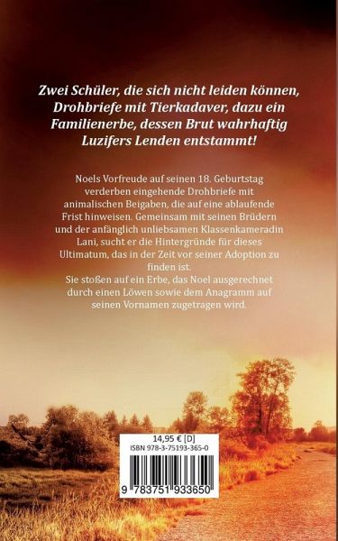 Zwei Schüler, die sich nicht leiden können, Drohbriefe mit Tierkadaver, dazu ein Familienerbe, dessen Blut wahrhaftig Luzifers Lenden entstammt!Noels Vorfreude auf seinen 18. Geburtstag verderben eingehende Drohbriefe mit animalischen Beigaben, die auf eine ablaufende Frist hinweisen. Gemeinsam mit seinen Brüdern und der anfänglich unliebsamen Klassenkameradin Lani, sucht er die Hintergründe für dieses Ultimatum, das in einer Zeit vor seiner Adoption zu finden ist.Sie stoßen auf ein Erbe, das Noel ausgerechnet durch einen Löwen sowie dem Anagramm auf seinen Vornamen zugetragen wird.