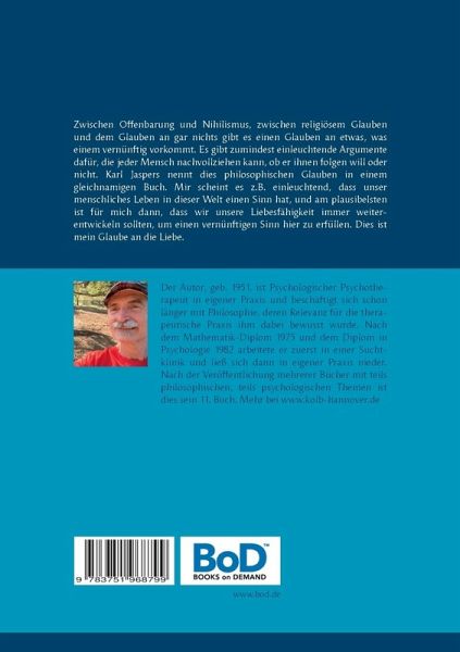 Zwischen Offenbarung und Nihilismus, zwischen religiösem Glauben und dem Glauben an gar nichts gibt es einen Glauben an etwas, was einem vernünftig vorkommt. Es gibt zumindest einleuchtende Argumente dafür, die jeder Mensch nachvollziehen kann, ob er ihnen folgen will oder nicht. Karl Jaspers nennt dies philosophischen Glauben in einem gleichnamigen Buch. Mir scheint es z.B. einleuchtend, dass unser menschliches Leben in dieser Welt einen Sinn hat, und am plausibelsten ist für mich dann, dass wir unsere Liebesfähigkeit immer weiterentwickeln sollten, um einen vernünftigen Sinn hier zu erfüllen. Dies ist mein Glaube an die Liebe.