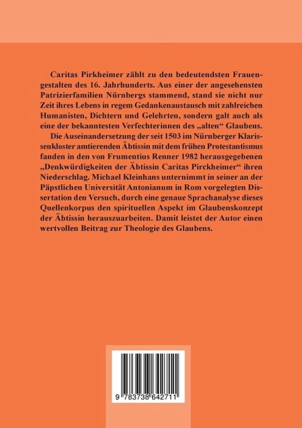 Caritas Pirkheimer zählt zu den bedeutendsten Frauengestalten des 16. Jahrhunderts. Aus einer der angesehensten Patrizierfamilien Nürnbergs stammend, stand sie nicht nur Zeit ihres Lebens in regem Gedankenaustausch mit zahlreichen Humanisten, Dichtern und Gelehrten, sondern galt auch als eine der bekanntesten Verfechterinnen des "alten" Glaubens. Die Auseinandersetzung der seit 1503 im Nürnberger Klarissenkloster amtierenden Äbtissin mit dem frühen Protestantismus fanden in den von Frumentius Renner 1982 herausgegebenen "Denkwürdigkeiten der Äbtissin Caritas Pirckheimer" ihren Niederschlag. Michael Kleinhans unternimmt in seiner an der Päpstlichen Universität Antonianum in Rom vorgelegten Dissertation den Versuch, durch eine genaue Sprachanalyse dieses Quellenkorpus den spirituellen Aspekt im Glaubenskonzept der Äbtissin herauszuarbeiten. Damit leistet der Autor einen wertvollen Beitrag zur Theologie des Glaubens.
