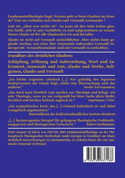 Fundamentaltheologie fragt: Worum geht es beim Glauben im Grunde. Und wie verhalten sich Vernunft und Glauben zueinander?Die christliche Botschaft beansprucht, "Wort Gottes" zu sein. Dieser Anspruch ist alles andere als von vornherein selbstverständlich. Zunächst ist zu fragen, wie man überhaupt von "Gott" reden kann, wenn die Botschaft selbst sagt, er falle gar nicht unter Begriffe. Und wie kann man ihm gar zuschreiben, dass er selber "spreche"? Gerade gegenüber solchen Fragen öffnet sich die christliche Botschaft und macht ihren Anspruch durch ihren Inhalt verständlich. Sie erläutert das Wort "Gott" durch den Hinweis auf die Geschöpflichkeit der Welt: Gott ist "ohne wen nichts ist". Mit Hilfe einer "relationalen Ontologie" lässt sich Geschöpflichkeit beweisen. Man begreift dabei von Gott immer nur das von ihm Verschiedene, das auf ihn verweist. Der Glaube selbst ist das Anteilhaben am Verhältnis Jesu zu Gott. Aufgrund seines Wortes vertraut man darauf, in die Liebe Gottes zu ihm, die unbedingt und ewig ist, aufgenommen zu sein. Im Vertrauen darauf steht man nicht mehr unter der Macht der Angst um sich selbst. Alle einzelnen Glaubensaussagen lassen sich darauf zurückführen. Die Kirche ist das fortdauernde Geschehen der Weitergabe des Wortes Gottes, und dieser Glaube ist ein und derselbe für alle, die an Jesus Christus als den Sohn Gottes glauben.Dieser Glaube kommt von der gehörten Botschaft und lässt sich nicht auf bloße Vernunft zurückführen. Es kann jedoch nichts geglaubt werden, was einer ihre Autonomie wahrenden Vernunft widerspricht. Vernunfteinwände gegen den Glauben sind auf dem Feld der Vernunft selbst zu entkräften. Vernunft ist notwendig, um sich vor Aberglauben zu schützen.
