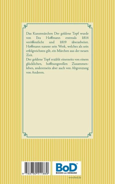 Das Kunstmärchen Der goldene Topf wurde von Eta Hoffmann erstmals 1814 veröffentlicht und 1819 überarbeitet. Hoffmann nannte sein Werk, welches als sein erfolgreichstes gilt, ein Märchen aus der neuen Zeit.Der goldene Topf erzählt einerseits vom glücklichen, hoffnungsvollen Zusammenleben, andererseits aber auch von Abgrenzung von Anderen.