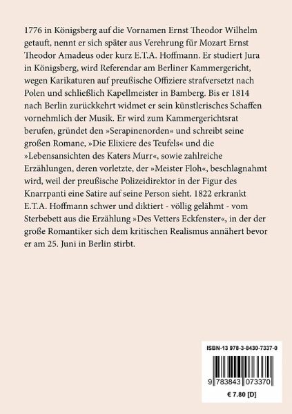 1776 in Königsberg auf die Vornamen Ernst Theodor Wilhelm getauft, nennt er sich später aus Verehrung für Mozart Ernst Theodor Amadeus oder kurz E.T.A. Hoffmann. Er studiert Jura in Königsberg, wird Referendar am Berliner Kammergericht, wegen Karikaturen auf preußische Offiziere strafversetzt nach Polen und schließlich Kapellmeister in Bamberg. Bis er 1814 nach Berlin zurückkehrt widmet er sein künstlerisches Schaffen vornehmlich der Musik. Er wird zum Kammergerichtsrat berufen, gründet den "Serapinenorden" und schreibt seine großen Romane, "Die Elixiere des Teufels" und die "Lebensansichten des Katers Murr", sowie zahlreiche Erzählungen, deren vorletzte, der "Meister Floh", beschlagnahmt wird, weil der preußische Polizeidirektor in der Figur des Knarrpanti eine Satire auf seine Person sieht. 1822 erkrankt E.T.A. Hoffmann schwer und diktiert - völlig gelähmt - vom Sterbebett aus die Erzählung "Des Vetters Eckfenster", in der der große Romantiker sich dem kritischen Realismus annähert bevor er am 25. Juni in Berlin stirbt.