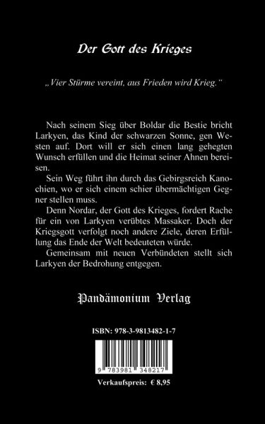 Nach seinem Sieg über Boldar, die Bestie, bricht Larkyen, der Sohn der schwarzen Sonne, gen Westen auf. Dort will er sich einen lang gehegten Wunsch erfüllen und die Heimat seiner Ahnen bereisen. Sein Weg führt ihn durch das Gebirgsreich Kanochien, wo er sich einem schier übermächtigen Gegner stellen muss. Denn Nordar, der Gott des Krieges, fordert Rache für ein von Larkyen verübtes Massaker. Doch der Kriegsgott verfolgt noch andere Ziele, deren Erfüllung das Ende der Welt bedeuten würde. Gemeinsam mit neuen Verbündeten stellt sich Larkyen der Bedrohung.