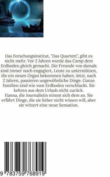 Das Forschungsinstitut, "Das Quartett", gibt es nicht mehr. Vor 2 Jahren wurde das Camp dem Erdboden gleich gemacht. Die Freunde von damals sind immer noch engagiert, Leute zu unterstützen, die ein neues Organ bekommen haben. Jetzt, nach 2 Jahren, passieren ungewöhnliche Dinge. Ganze Familien sind wie vom Erdboden verschluckt. Sie kommen aus ihrem Urlaub nicht mehr zurück. Hanna, die Journalistin nimmt sich dem an. Dabei erfährt sie Dinge, die sie lieber nicht wissen wollte, aber sie wittert eine neue Sensation. Kleine Anmerkung. Es gibt bereits das Buch "Das Quartett und das Tor des Todes". Es wäre sinnvoll, dieses Buch zuerst zu lesen, dann ist es einfacher die Charaktere der Freunde und die Geschichte besser zu verstehen. Vielen Dank!