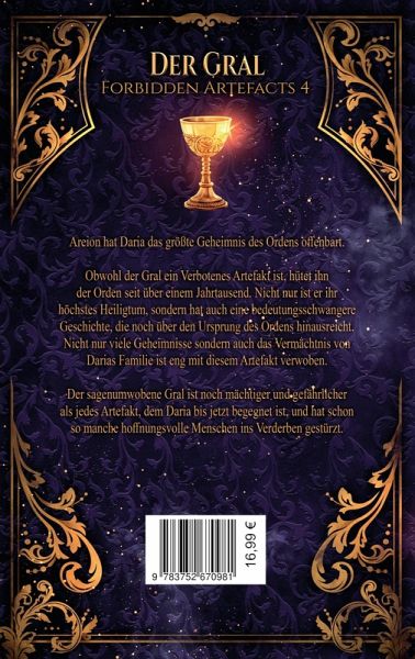 Areion hat Daria das größte Geheimnis des Ordens offenbart.Obwohl der Gral ein Verbotenes Artefakt ist, hütet ihn der Orden seit über einem Jahrtausend. Nicht nur ist er ihr höchstes Heiligtum, sondern hat auch eine bedeutungsschwangere Geschichte, die noch über den Ursprung des Ordens hinausreicht. Nicht nur viele Geheimnisse sondern auch das Vermächtnis von Darias Familie ist eng mit diesem Artefakt verwoben.Der sagenumwobene Gral ist noch mächtiger und gefährlicher als jedes Artefakt, dem Daria bis jetzt begegnet ist, und hat schon so manche hoffnungsvolle Menschen ins Verderben gestürzt.WarnungDieses Buch enthält Szenen von detailliert beschriebener Gewalt und mehr oder weniger gewaltsamem Ableben verschiedener Figuren.Der Gral ist der vierte Teil der Forbidden Artefacts Reihe und sollte nicht ohne Kenntnis der vorhergegangenen Bände gelesen werden.