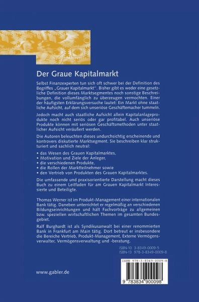 Mit diesem Buch werden erstmals umfassend die Rollen der Beteiligten am Grauen Kapitalmarkt dargestellt und deren Interessen, Rechte, Pflichten erläutert. Daneben werden ausgewählte Produkte besprochen und ihre individuellen Konzeptionsmerkmale im Einzelnen dargestellt. Weiterhin werden die wichtigsten Merkmale eines seriösen Vertriebs den unseriösen Praktiken gegenübergestellt und die Unterschiede für den Anleger deutlich gemacht.
