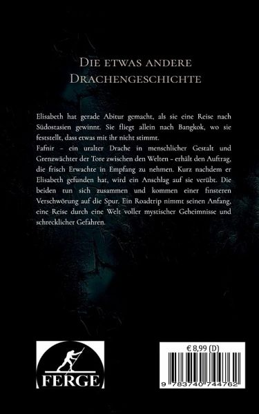 Die etwas andere Drachengeschichte Elisabeth hat gerade Abitur gemacht, als sie eine Reise nach Südostasien gewinnt. Sie fliegt allein nach Bangkok, wo sie feststellt, dass etwas mit ihr nicht stimmt. Fafnir - ein uralter Drache in menschlicher Gestalt und Grenzwächter der Tore zwischen den Welten - erhält den Auftrag, die frisch Erwachte in Empfang zu nehmen. Kurz nachdem er Elisabeth gefunden hat, wird ein Anschlag auf sie verübt. Die beiden tun sich zusammen und kommen einer finsteren Verschwörung auf die Spur. Ein Roadtrip nimmt seinen Anfang, eine Reise durch eine Welt voller mystischer Geheimnisse und schrecklicher Gefahren.