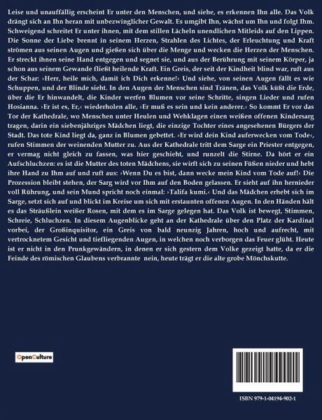 Leise und unauffällig erscheint Er unter den Menschen, und siehe, es erkennen Ihn alle. Das Volk drängt sich an Ihn heran mit unbezwinglicher Gewalt. Es umgibt Ihn, wächst um Ihn und folgt Ihm. Schweigend schreitet Er unter ihnen, mit dem stillen Lächeln unendlichen Mitleids auf den Lippen. Die Sonne der Liebe brennt in seinem Herzen, Strahlen des Lichtes, der Erleuchtung und Kraft strömen aus seinen Augen und gießen sich über die Menge und wecken die Herzen der Menschen. Er streckt ihnen seine Hand entgegen und segnet sie, und aus der Berührung mit seinem Körper, ja schon aus seinem Gewande fließt heilende Kraft. Ein Greis, der seit der Kindheit blind war, ruft aus der Schar: ¿Herr, heile mich, damit ich Dich erkenne!¿ Und siehe, von seinen Augen fällt es wie Schuppen, und der Blinde sieht. In den Augen der Menschen sind Tränen, das Volk küßt die Erde, über die Er hinwandelt, die Kinder werfen Blumen vor seine Schritte, singen Lieder und rufen Hosianna. ¿Er ist es, Er,¿ wiederholen alle, ¿Er muß es sein und kein anderer.¿ So kommt Er vor das Tor der Kathedrale, wo Menschen unter Heulen und Wehklagen einen weißen offenen Kindersarg tragen, darin ein siebenjähriges Mädchen liegt, die einzige Tochter eines angesehenen Bürgers der Stadt. Das tote Kind liegt da, ganz in Blumen gebettet. ¿Er wird dein Kind auferwecken vom Tode¿, rufen Stimmen der weinenden Mutter zu. Aus der Kathedrale tritt dem Sarge ein Priester entgegen, er vermag nicht gleich zu fassen, was hier geschieht, und runzelt die Stirne. Da hört er ein Aufschluchzen: es ist die Mutter des toten Mädchens, sie wirft sich zu seinen Füßen nieder und hebt ihre Hand zu Ihm auf und ruft aus: ¿Wenn Du es bist, dann wecke mein Kind vom Tode auf!¿ Die Prozession bleibt stehen, der Sarg wird vor Ihm auf den Boden gelassen. Er sieht auf ihn hernieder voll Rührung, und sein Mund spricht noch einmal: ¿Talifa kumi.¿ Und das Mädchen erhebt sich im Sarge, setzt sich auf und blickt im Kreise um sich mit erstaunten offenen Augen. In den Händen hält es das Sträußlein weißer Rosen, mit dem es im Sarge gelegen hat. Das Volk ist bewegt, Stimmen, Schreie, Schluchzen. In diesem Augenblicke geht an der Kathedrale über den Platz der Kardinal vorbei, der Großinquisitor, ein Greis von bald neunzig Jahren, hoch und aufrecht, mit vertrocknetem Gesicht und tiefliegenden Augen, in welchen noch verborgen das Feuer glüht. Heute ist er nicht in den Prunkgewändern, in denen er sich gestern dem Volke gezeigt hatte, da er die Feinde des römischen Glaubens verbrannte nein, heute trägt er die alte grobe Mönchskutte.