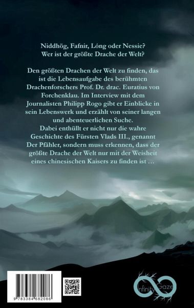 Niddhög, Fafnir, Lóng oder Nessie? Wer ist der größte Drache der Welt?Den größten Drachen der Welt zu finden, das ist die Lebensaufgabe des berühmten Drachenforschers Prof. Dr. drac. Euratius von Forchenklau. Im Interview mit dem Journalisten Philipp Rogo gibt er Einblicke in sein Lebenswerk und erzählt von seiner langen und abenteuerlichen Suche. Dabei enthüllt er nicht nur die wahre Geschichte des Fürsten Vlads III., genannt Der Pfähler, sondern muss erkennen, dass der größte Drache der Welt nur mit der Weisheit eines chinesischen Kaisers zu finden ist ...