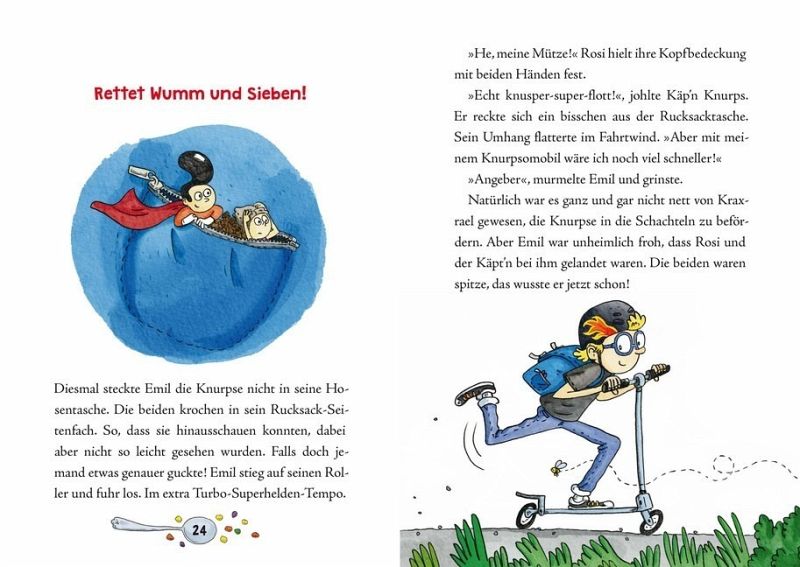 So ist Lesen kinderleicht: Ein sprachwitzige Abenteuer mit kurzen Kapiteln und farbigen Illustrationen ab 7 Jahren! Platsch! Etwas ist in Emils Müslischüssel gelandet. Es ist klein. Tomatenrot. Und es hangelt sich an seinem Löffel hoch! Die lebendig gewordene Sammelfigur stellt sich als Käpt'n Knurps (der große Käpt'n Knurps!) vor - und stürzt Emil und seine Mitschülerin Elsa sofort in ein Abenteuer. Denn er hat eine Mission: So schnell wie möglich seine anderen Mini-Freunde finden. Aber auch ihr mies-muffeliger Erzfeind Lord Kraxrael, der nichts mehr liebt als Ärger, hat sich aus einer Cornflakes-Packung heraus in Emils Welt gefressen ... Eine humorvolle Geschichte, in der Kleine ganz groß rauskommen.