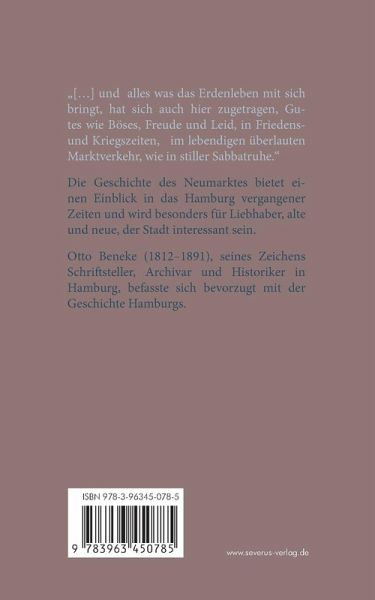 "[...] und alles was das Erdenleben mit sich bringt, hat sich auch hier zugetragen, Gutes wie Böses, Freude und Leid, in Friedens- und Kriegszeiten, im lebendigen überlauten Marktverkehr, wie in stiller Sabbatruhe." Die Geschichte des Neumarktes bietet einen Einblick in das Hamburg vergangener Zeiten und wird besonders für Liebhaber, alte und neue, der Stadt interessant sein. Otto Beneke (1812-1891), seines Zeichens Schriftsteller, Archivar und Historiker in Hamburg, befasste sich bevorzugt mit der Geschichte Hamburgs.