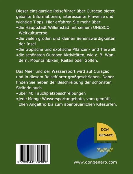 5. aktualisierte und AuflageFür alle, die ihren Urlaub auf Curacao entspannt und gleichzeitig aktiv gestalten wollen, ist dieser Reiseführer geschrieben. Der große Outdoor-Reiseführer mit 146 Seiten und vielen farbigen Seiten ist nun bereits in der vierten und aktualisierten Auflage erhältlich und bietet jetzt noch mehr Informationen und echte Insider-Tipps, denn die Autoren leben selber auf der Insel und wissen, wo es sich lohnt hinzugehen.In Teil A finden Sie alles Wissenswerte und Wissensnotwendige über die Insel Curacao von "A"- wie Anreise bis "Z" wie Zeitzone.Teil B beschreibt die Hauptstadt Willemstad und das einzigartige UNESCO Weltkulturerbe, die Sehenswürdigkeiten und alle Ausflugsziele. Darüber hinaus finden Sie hier Informationen zu den großen Veranstaltungen, Straßenfeste und Events auf Curacao. Lesen Sie mehr über die besten Restaurants, die schönsten Strandbars und die heißesten Clubs. Teil B informiert Sie auch zum Thema Einkaufen und Shoppen auf Curacao und liefert Preisinformationen.In Teil C erfahren Sie mehr über- Die tropische und exotischen Pflanzen- und Tierwelt- Die beiden großen Nationalparks Curaçaos- Die bunte Architektur, die Landhäuser und die FortsAußerdem gibt es hier alle wichtigen Informationen zu allen Outdoor Sport- und Freizeitmöglichkeiten, die man an Land unternehmen kann.Teil D ist ausschließlich dem Meer, den Stränden und den Wassersport-Freizeitmöglichkeiten gewidmet. Hier finden Sie Informationen, Tipps und wichtige Hinweise zum Thema Schwimmen, Schnorcheln und Tauchen auf Curacao.Weiterhin sind alle Strände beschrieben und Sie finden die Beschreibungen von allen spannenden Wassersportarten.Das Buch bietet aufgrund des großen Interesses und vieler Nachfragen zwei Sonderteile:- Ein Sonderteil über den Wunderbaum Moringa- Ein Sonderteil mit dem Titel: Auswandern nach Curacao