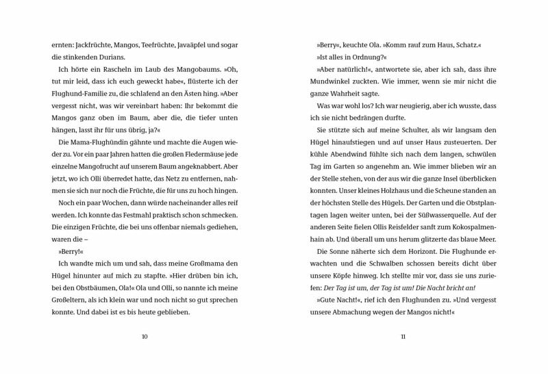 »Ich habe eine Extraportion Honigpfannkuchen gebacken.« Sie (Berrys Oma) drückte fest meine Hand. »Die kannst du dir mit den anderen Kindern auf der Überfahrt teilen. Dann findest du gleich Freunde.«