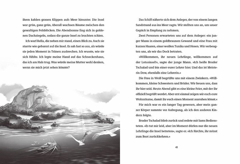 »Plötzlich spürte ich einen Ruck an meinem Herzen, wie eine Angelschnur, die bis zum Zerreißen gespannt ist. Es gab noch so viel, was ich den beiden sagen wollte! Aber der Bootsmotor heulte auf, der Wind wehte mir die Haare in den Nacken und meine Insel war nur noch ein Punkt am Horizont.