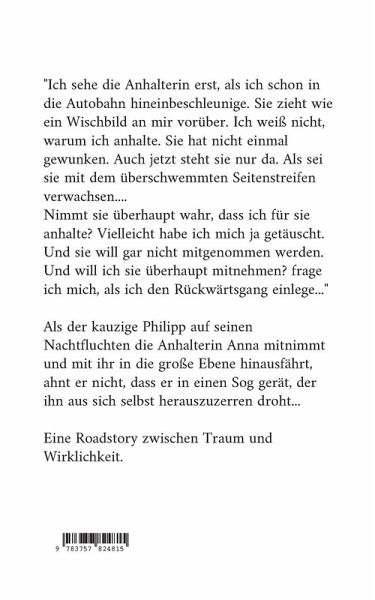 "Ich weiß nicht, warum ich angehalten habe. Sie hat nicht einmal gewunken. Auch jetzt steht sie nur da. Als sei sie mit dem überschwemmten Seitenstreifen verwachsen.... Nimmt sie überhaupt wahr, dass ich für sie anhalte? Vielleicht habe ich mich ja getäuscht. Und sie will gar nicht mitgenommen werden. Und will ich sie überhaupt mitnehmen? Frage ich mich, als ich den Rückwärtsgang einlege..." Als der kauzige Philipp auf seinen Nachtfluchten die Anhalterin Anna mitnimmt und mit ihr in die große Ebene ninausfährt, ahnt er nicht, dass er in einen Sog gerät, der ihn aus sich selbst herauszuzerren droht...Eine Roadstory zwischen Traum und Wirklichkeit.
